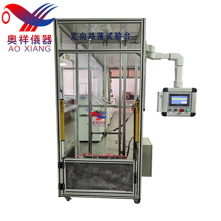 测试过程:人工把样品放入夹具内夹持→夹具上升至设定高度值停止→按跌落按键(触摸屏上的释放按键图标)→ 夹具和样品一同成自由下落→当下落到300mm (可根据样品需要进行调节,调节范围是指样品的 边,角,面 与底板间的距离,可调整感应器开关高低位置)的高度时夹具松开样品→样品自由落体跌落在试验板上。